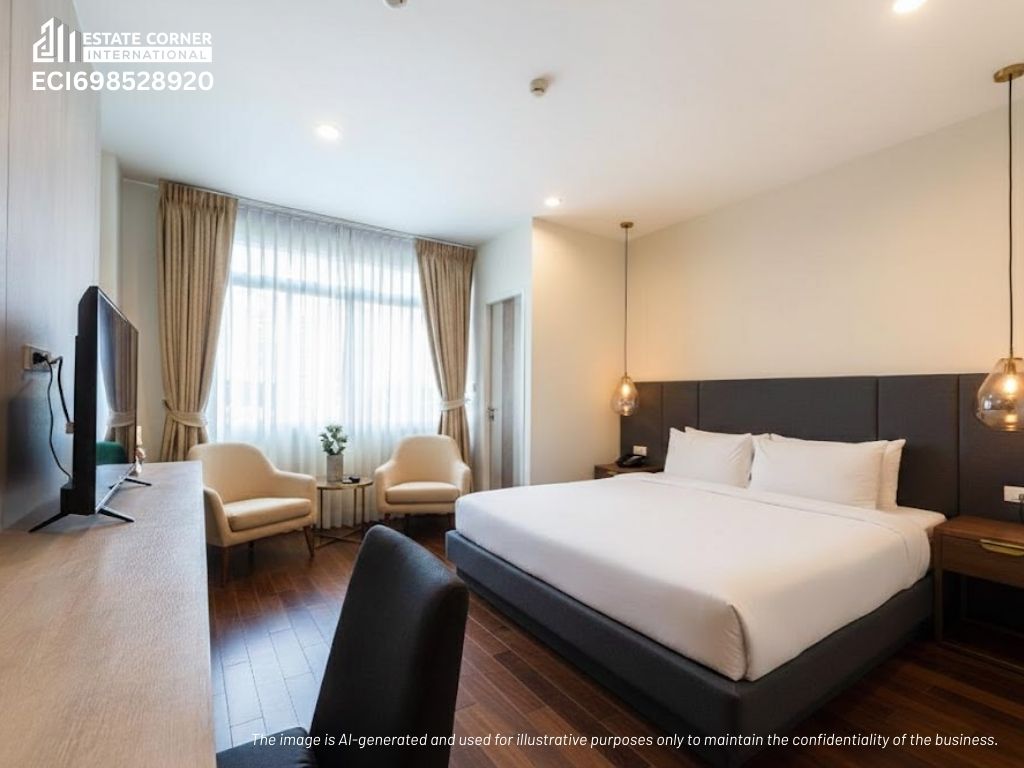 This Hotel for Sale offers 114 keys on a 4-1-93.5 rai freehold site along Bangna-Trad KM26, a core logistics and manufacturing corridor east of Bangkok. The property operates as an upper-midscale serviced residence with studio and suite inventory sized 28 to 48 sq.m. Current occupancy near 60% reflects steady corporate and long-stay demand. The Hotel Investment shows low entry cost at about THB 2.54M per key. Large land and existing facilities support repositioning or brand affiliation.